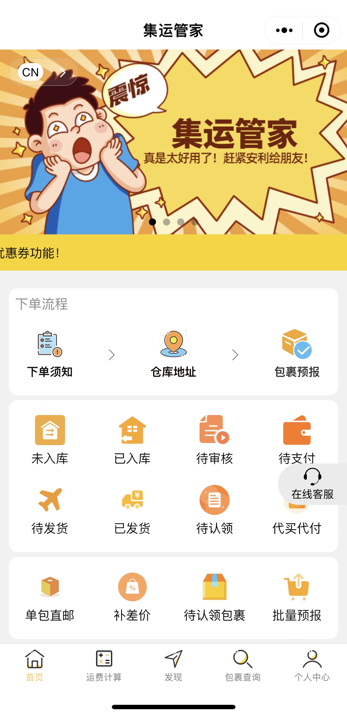 嗨轉寶集運小程序清晰明了的訂單管理系統:待打包、待支付、待發貨、貨到付款、已發貨一目了然